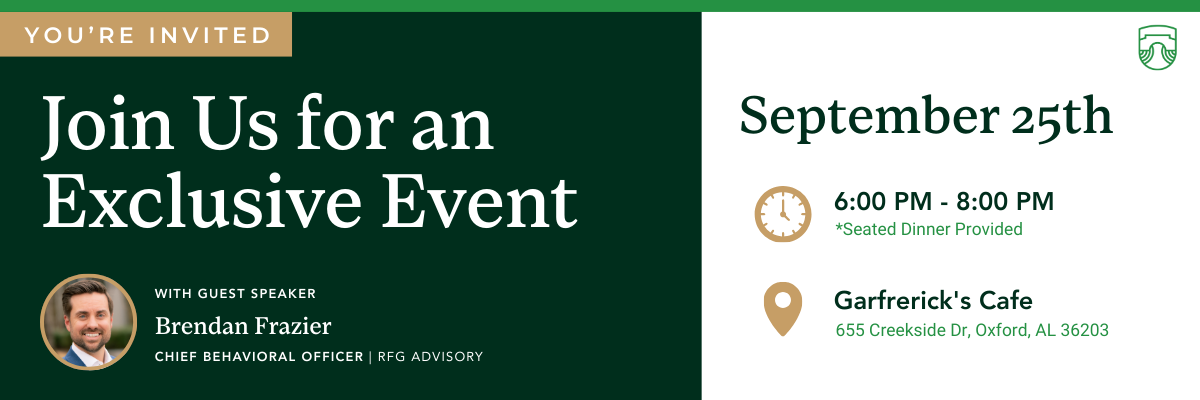 September 25, 2025, Join Cheaha Wealth Management for an exclusive event with Guest Speaker Brendan Frazier RFG Advisory Chief Behavioral Officer.